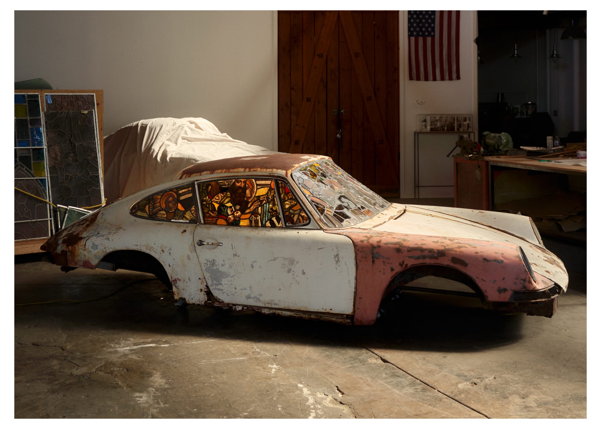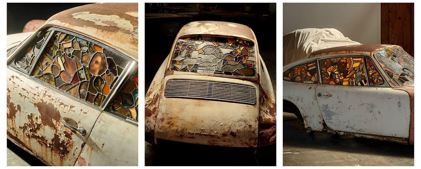Back in July, photographer Seth Caplan also followed the light. And he too found it doing things he wasn’t used to seeing it do. He saw it peeking through the windows of derelict vintage Porsche cars, where devotional stained glass took the place of transparency—the work of LA glass artist Ben Tuna, who runs Glass Visions Studio out of a garage in Glendale.