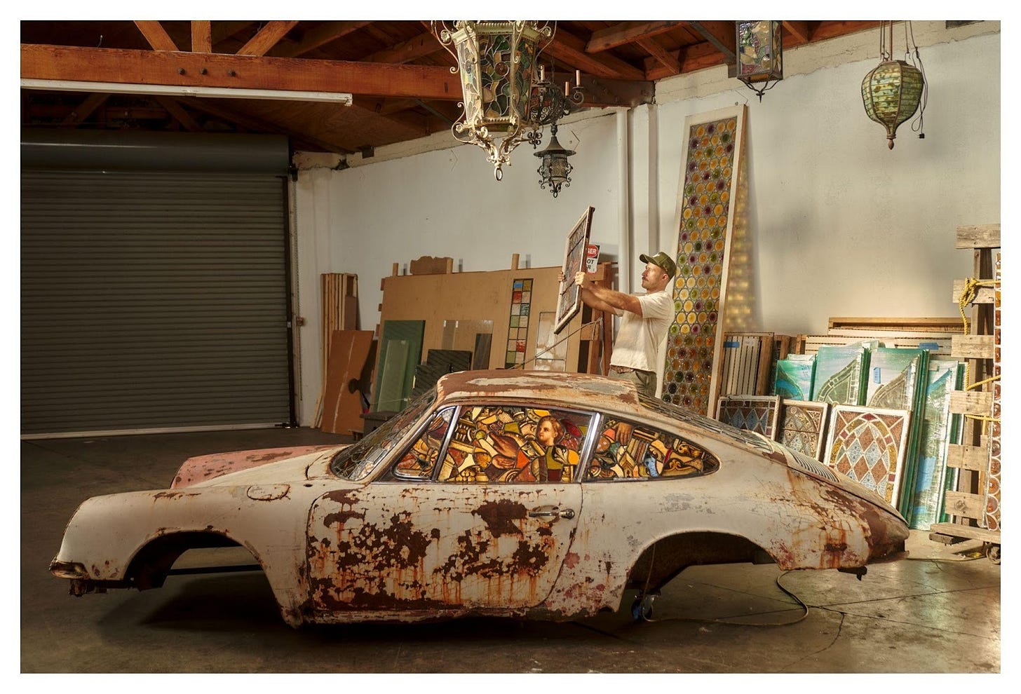 Ben’s studio is stunning. There’s a dreamy quality to it, with the car installed in the middle of this huge space, and the stories of all of the elements mixing together—the patina of the car body, the repurposed glass, and the studio’s own industrial past.7