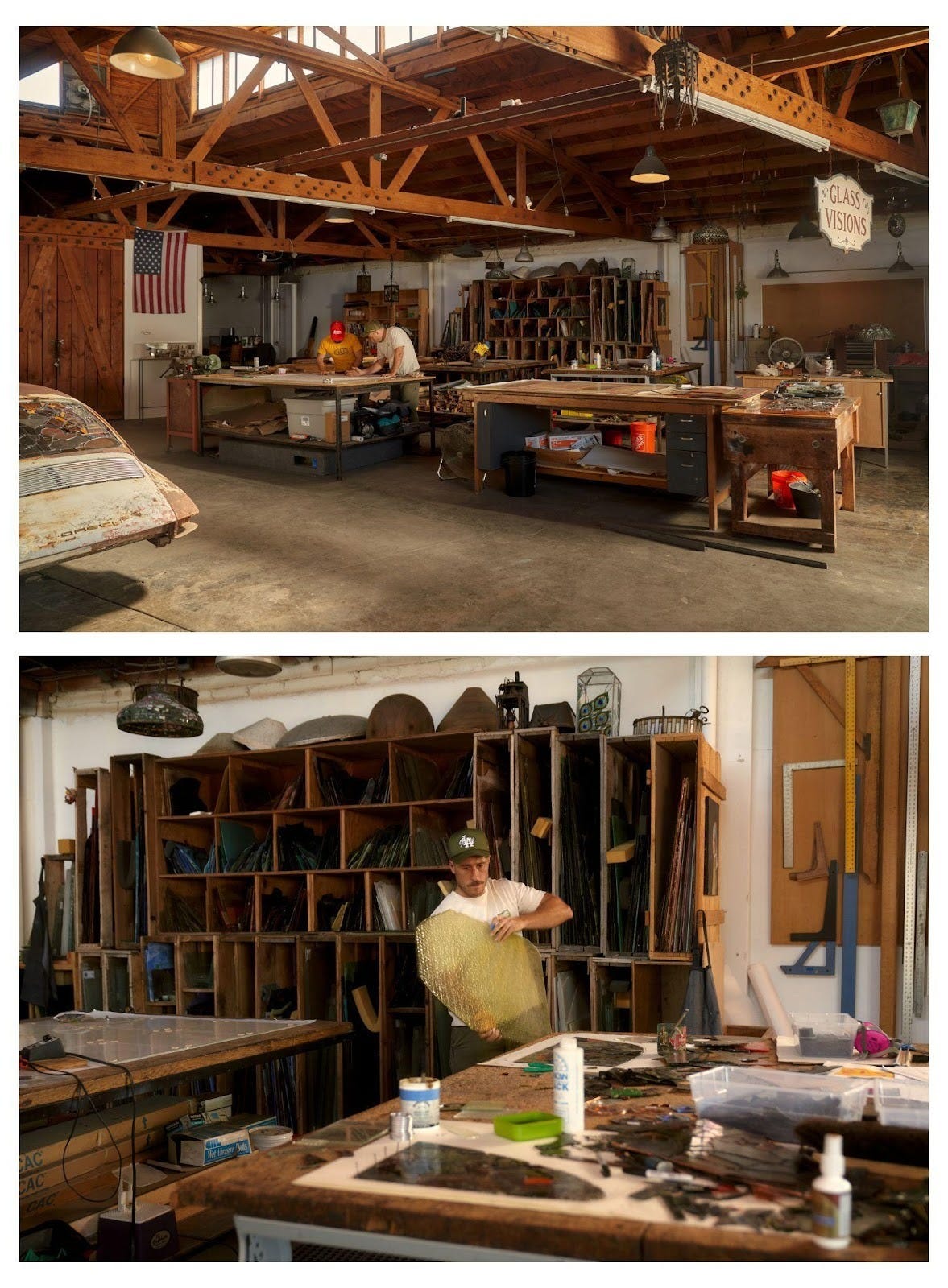 Inspired by Seth’s photos of his studio visit, I set out on a tandem journey to explore the practice of stained glass art, and the unexpected cult-car-art project Seth had turned me onto. What followed was a series of conversations with experts, historians, and practitioners of related disciplines, all sourced based on an instinct that they could shine light on the subject matter—its history, work, industry, and art.