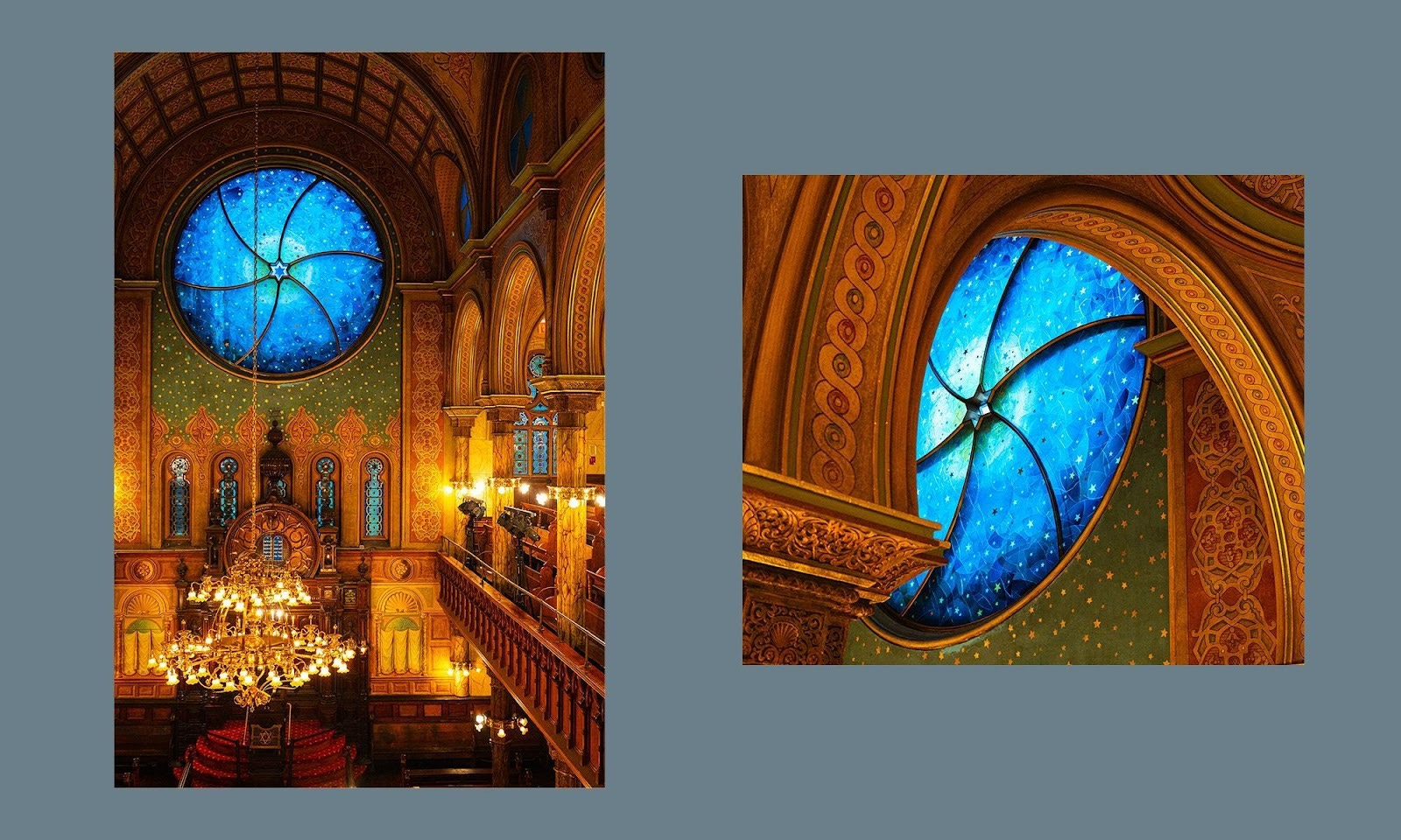 It’s late afternoon and I’m at the Eldridge Street Synagogue in New York City, on a balcony above the sanctuary’s pulpit, staring up at the circular, cobalt-colored East Window. Contemporary in an otherwise historically preserved 19th-century sanctuary, the engulfing piece is 16 feet across, twinkling with a near-white interior circle and a receding deeper-hued perimeter. There’s a smattering of tiny metallic stars around the edges. The piece is a mesmerizing manipulation of light—light doing things I’m not used to seeing it do.