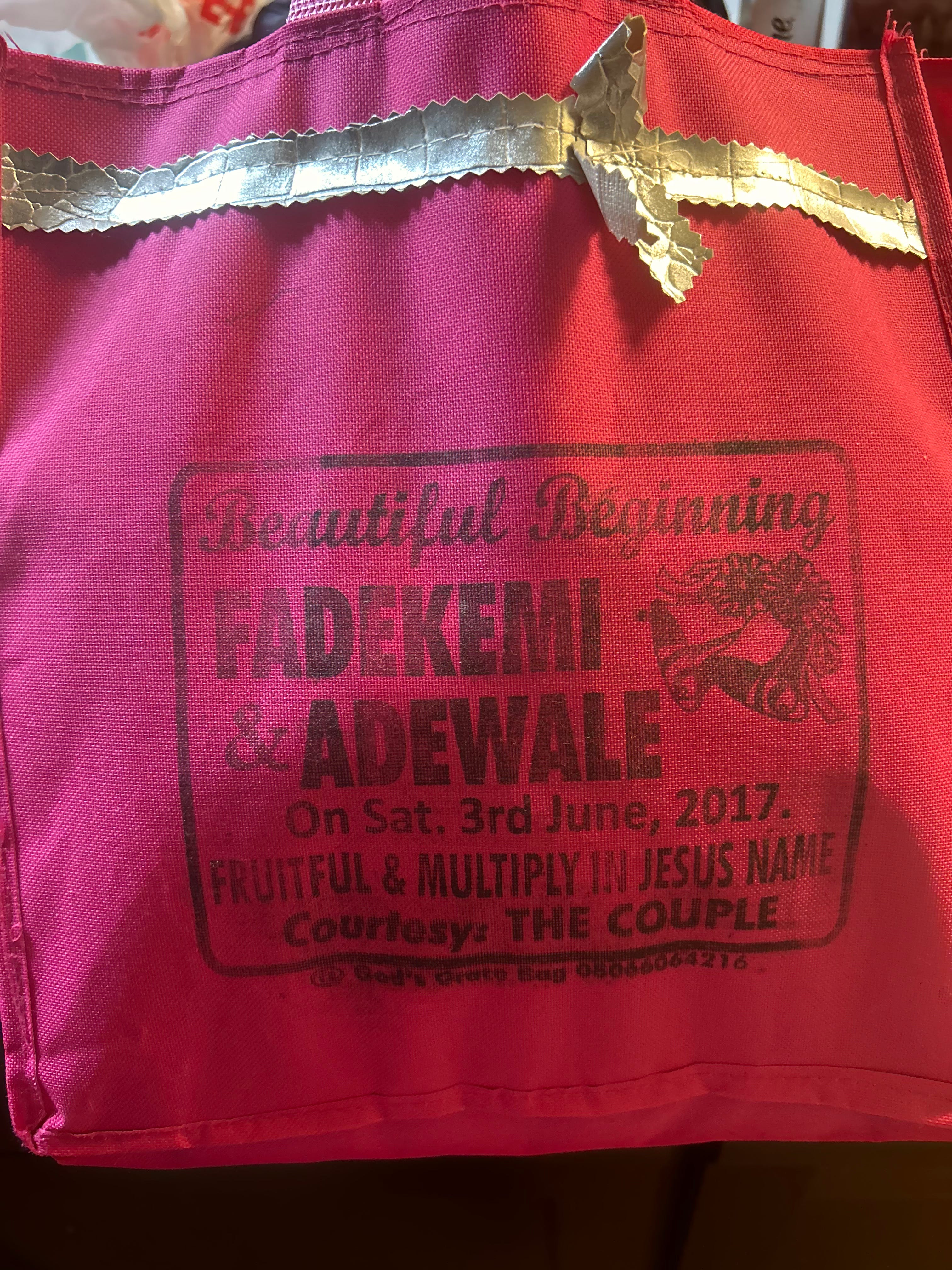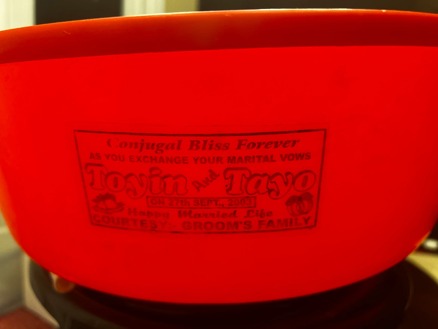 It’s common for a sentimental object to also be useful—Grandmamá’s cane or the family fine china are proof of that. But it’s more of a rarity, at least in America, that useful objects overtly announce their sentimentality. Not so in Nigeria or within its diaspora. Every Nigerian I’ve ever met could tell a story about how they attended a special event—usually a wedding, funeral, graduation, or birthday—and left with a practical, personalized, “ICON SOARS”-like doodad as a party favor. Buckets, pens, journals, keychains, towels of varying sizes, cooking implements, the kitchen sink.