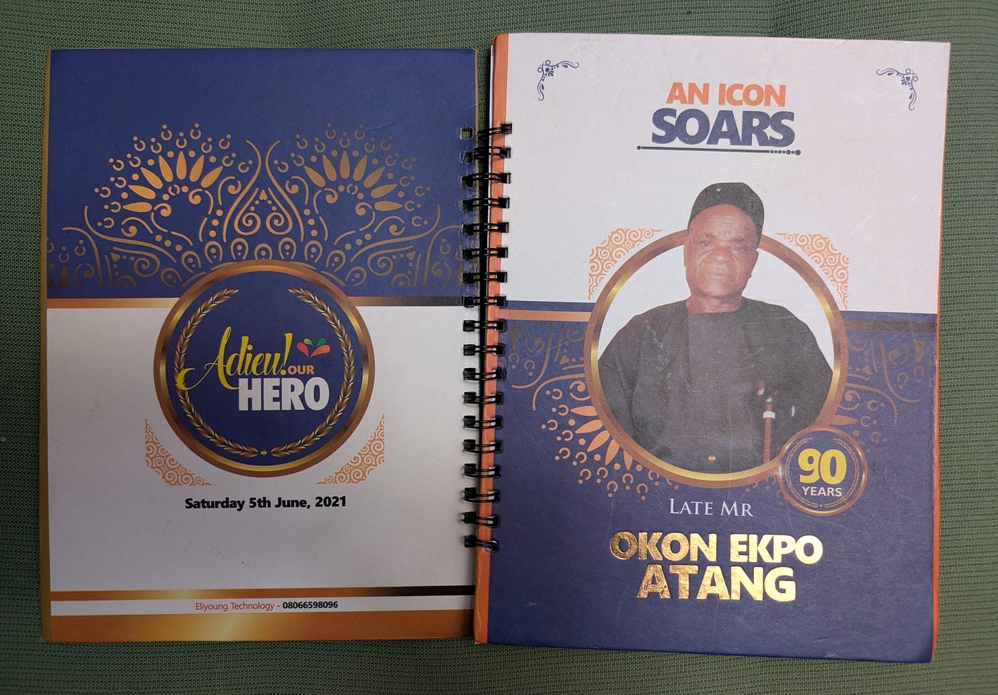 The front cover reads “AN ICON SOARS / Late Mr Okon Ekpo Atang / 90 YEARS” and features a photograph of my paternal grandfather. The back is the inverse of the front, with a few alterations, the most significant of which is a replacement of the photo with a written goodbye: “Adieu! OUR HERO.” Every page inside the notebook itself features the copy from the covers. Scribblings fill some pages; others contain frantic handwriting—repeated sentences I jotted down when I was learning lines for an acting gig. Most pages have been torn out, their fate lost to history.